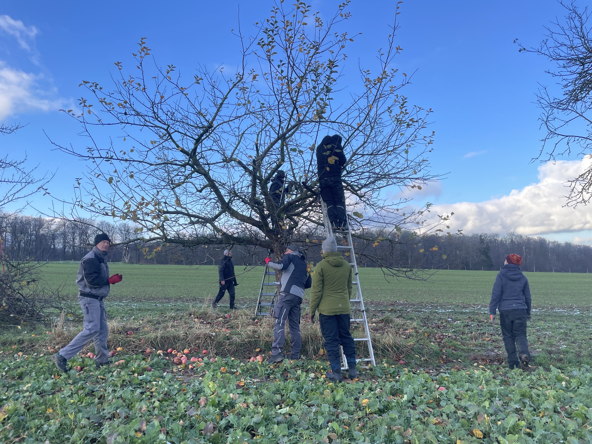 Nach jeweils einem theoretischen Input zu den grundsätzlichen Regeln des naturgemäßen Obstbaumschnittes und der Möglichkeit, offene Fragen zu klären, konnte das neue Fachwissen anschließend eigens an Bäumen in den Gemarkungen erprobt werden. In Eberschütz konnten so zunächst mehrere Jungbäume wieder in Form gebracht werden. In den ersten circa 10 Jahren nach Setzen eines Obstbaumes sollte dieser jährlich geschnitten werden, um eine ausgeglichene, gut belichtete stabile Krone und damit Vitalität und Ertrag zu gewährleisten. Bei bereits ausgewachsenen Bäumen, wie in Zwergen auf der Hohen Wiese, wurde durch einen Erhaltungsschnitt die Stabilität der Bäume gesichert, eventuelles Totholz entfernt oder die Krone weiter ausgelichtet. Auch hier tauchte die Mistel auf, die zwar jetzt in der bevorstehenden Weihnachtszeit als beliebte Dekoration gilt, für Bäume im Spezielen Obstbäume jedoch durch ihr parasitäres Verhalten eine große Gefährdung darstellt. Sie wurde also kurzerhand entfernt und dient jetzt dem einen oder der anderen Teilnehmer*in als Weihnachtsschmuck zu Hause und der Obstbaum ist den Halbschmarotzer los.