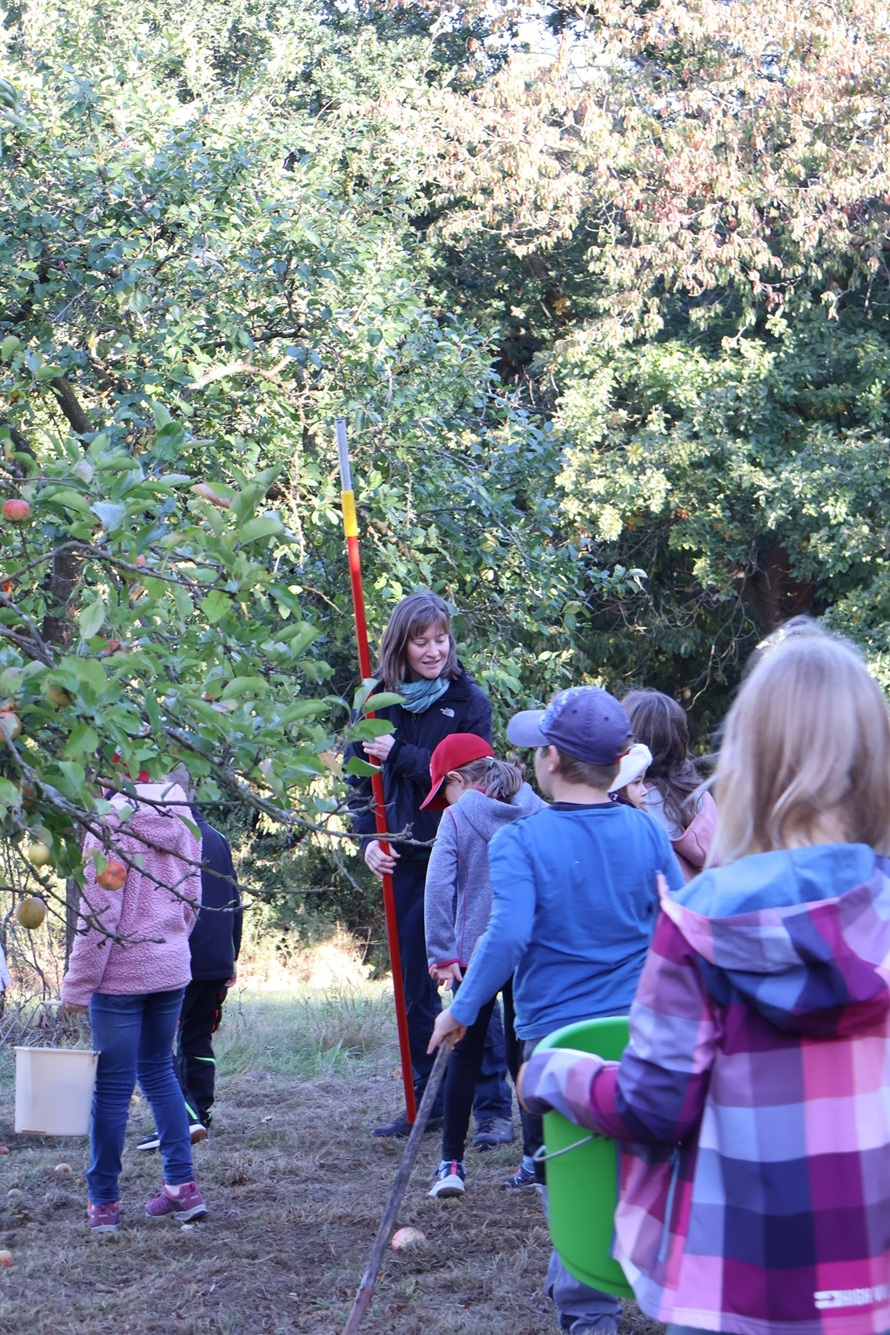 Auf die Fragen „Was wächst hier?“, „Welche Tiere leben hier?“ oder „Wie wird eigentlich Apfelsaft gemacht?“ hatten die Kinder schon einige Antworten parat, die nicht zuletzt durch spannende Fakten und Erklärungen von Rebecca Kessler (LPV) ergänzt wurden. Mit neuem Wissen und Eifer über den Lebensraum Streuobstwiese und seine vielfältigen Nutzungsmöglichkeiten konnten die Kinder einen ganzen Big Pack (circa 500kg) voll Äpfel sammeln. Diese tolle Leistung soll natürlich auch belohnt werden und die Klasse erhält die Äpfel in Form von Saft, hergestellt von der Kelterei Gerth in Reinhardshagen, zurück.